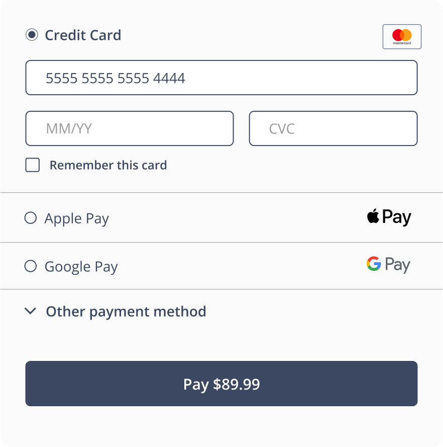Offer your customers multiple payment options to complete their journey successfuly. The best strategy for customer-oriented business is to make it possible to find payment method your customers expect or need depending on their location, age, preferences, etc